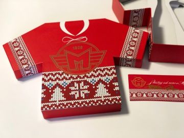Naši konstruktéři přišli s návrhem a variantou sportovního dresu v podobě dvoudílné krabice barevně evokující skutečné hráčské dresy. Uvnitř krabice je vlepená kartonová vložka s výsekem na dárková balení.